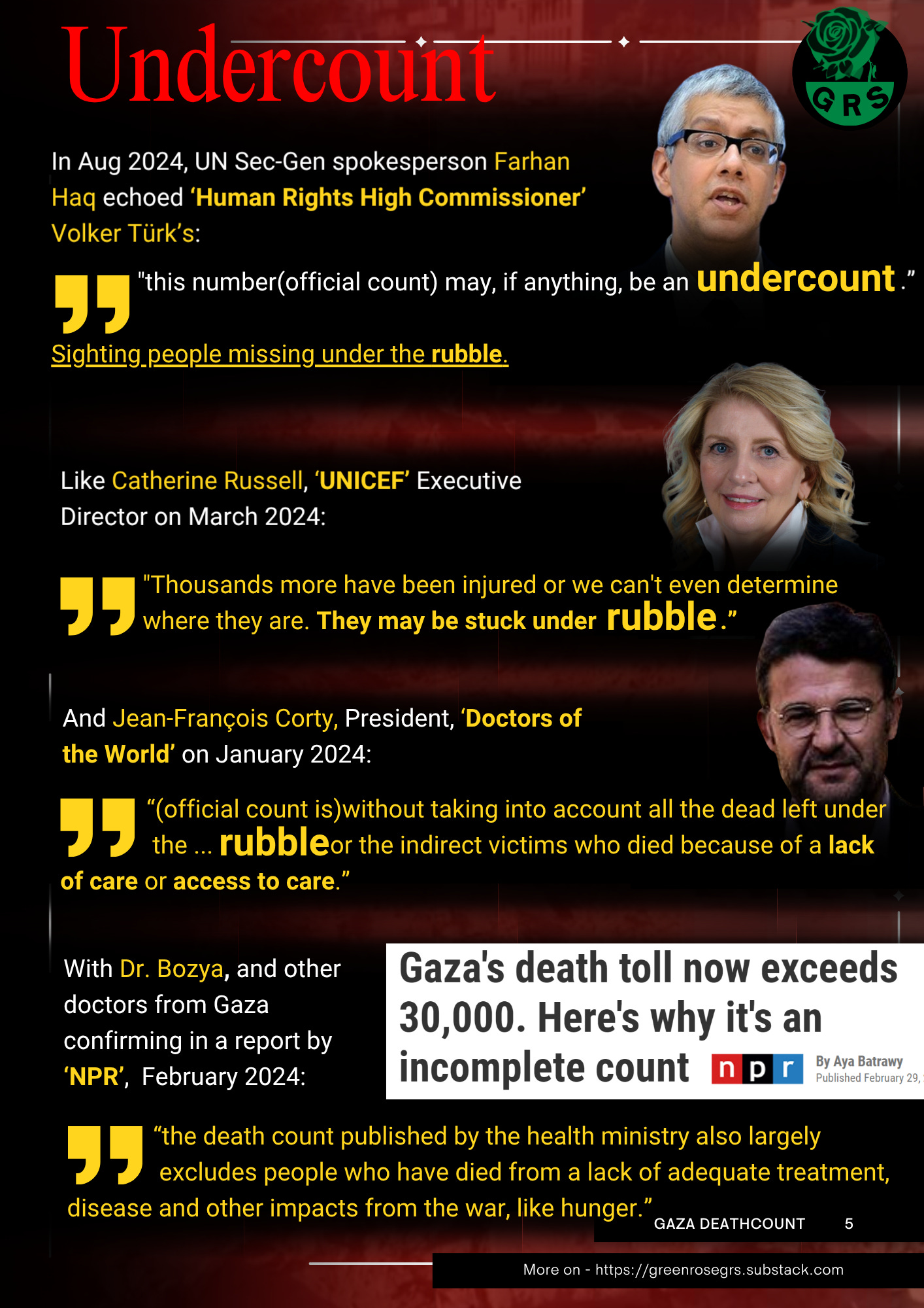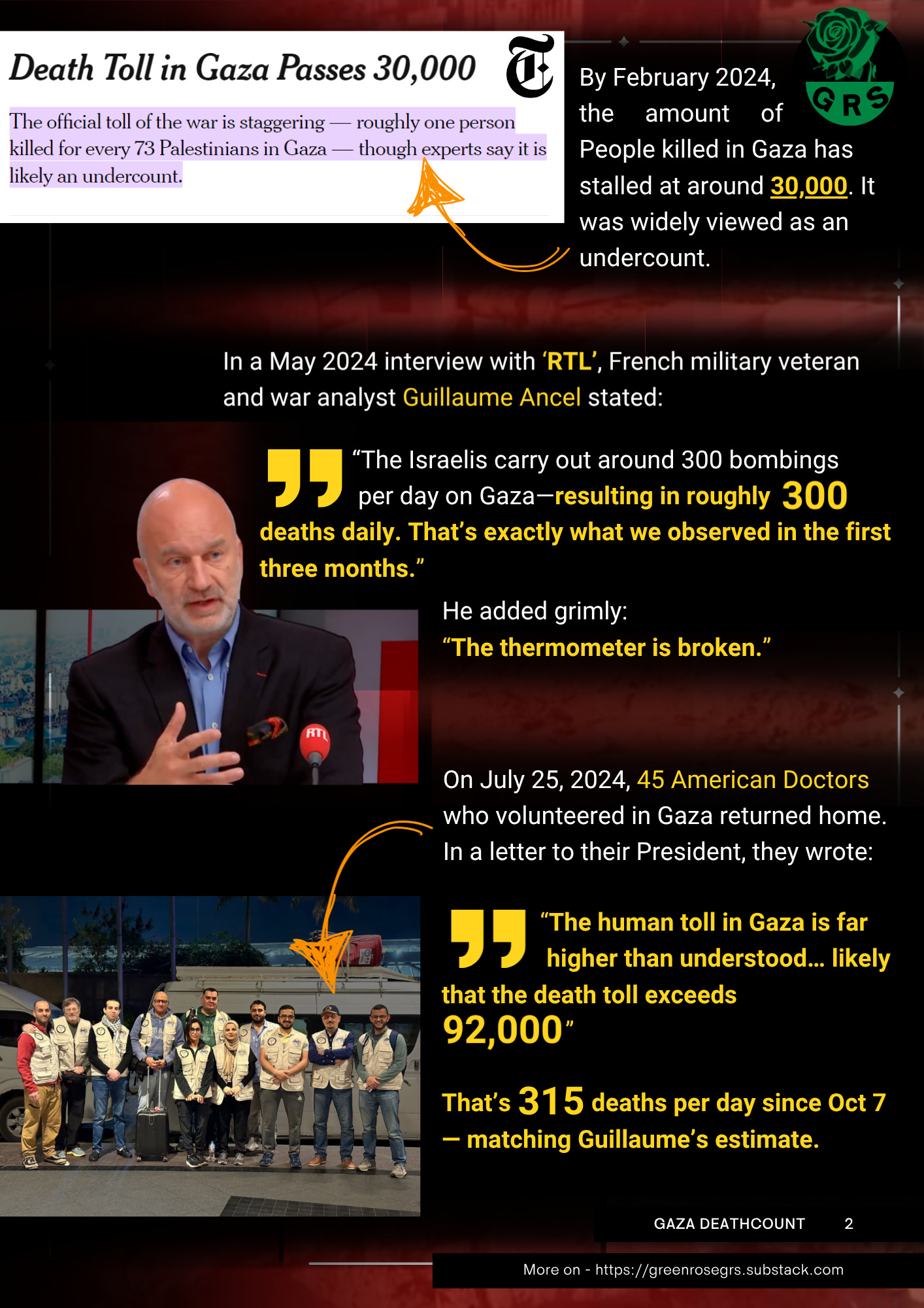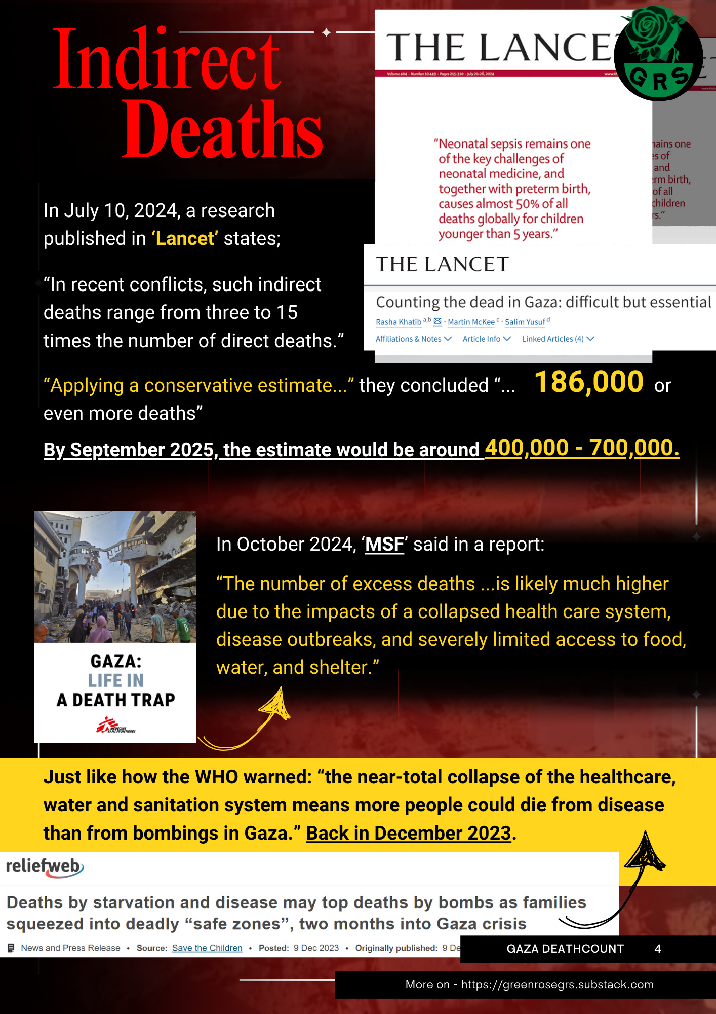 The real number is higher — everyone on the ground knows it, and so does anyone who understands destruction: experts, war analysts, and mortality researchers, as well as anyone willing to look at the data. Hospitals and health systems have been systematically destroyed. Tens of thousands are missing, and many more have died from indirect causes — starvation, untreated injuries, disease, and the total collapse of care.