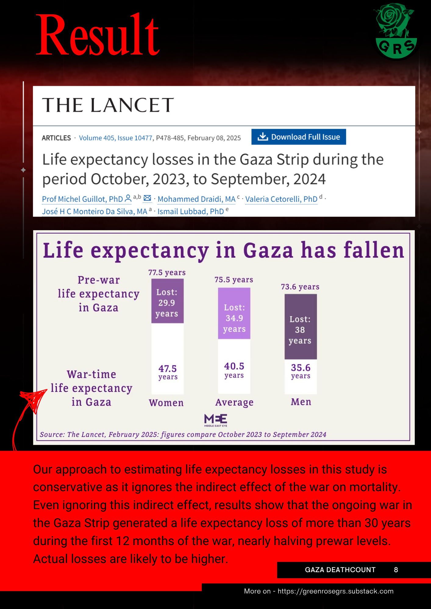 Prof Michel Guillot, et al. (2025, February 8) Life expectancy losses in the Gaza Strip during the period October, 2023, to September, 2024 [PDF] https://www.thelancet.com/journals/lancet/article/PIIS0140-6736(24)02810-1/abstract